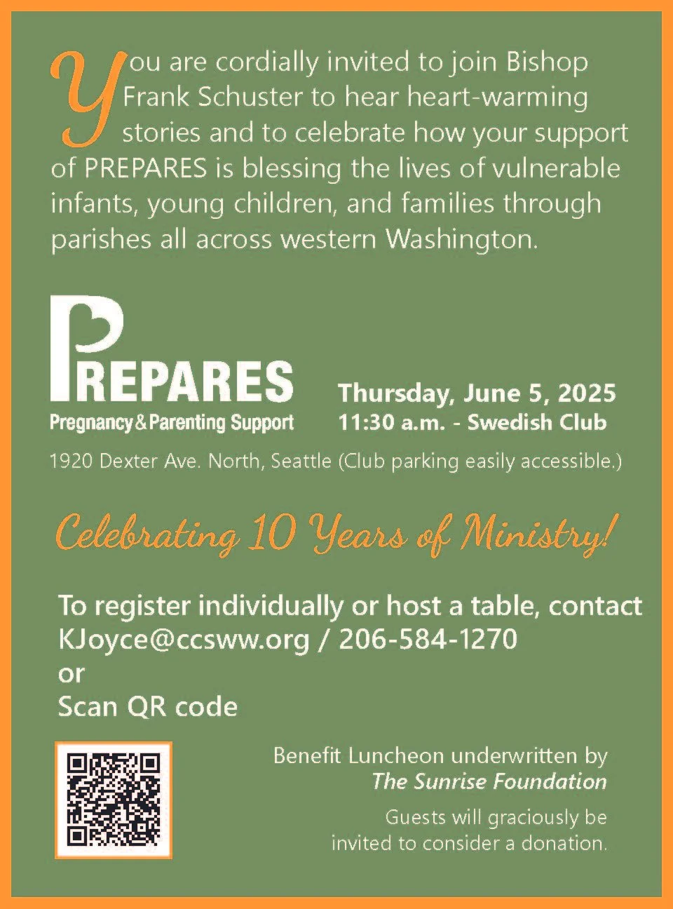 Please join us at the Mercer Island Community Center to hear heart-warming stories of how your support of PREPARES is blessing the lives of children and families throughout Western Washington. This luncheon is graciously underwritten by the Sunrise Foundation and guests are asked to prayerfully consider a donation to PREPARES. Proceeds from the luncheon will support programs throughout Western Washington, including our parish sustainability grant.